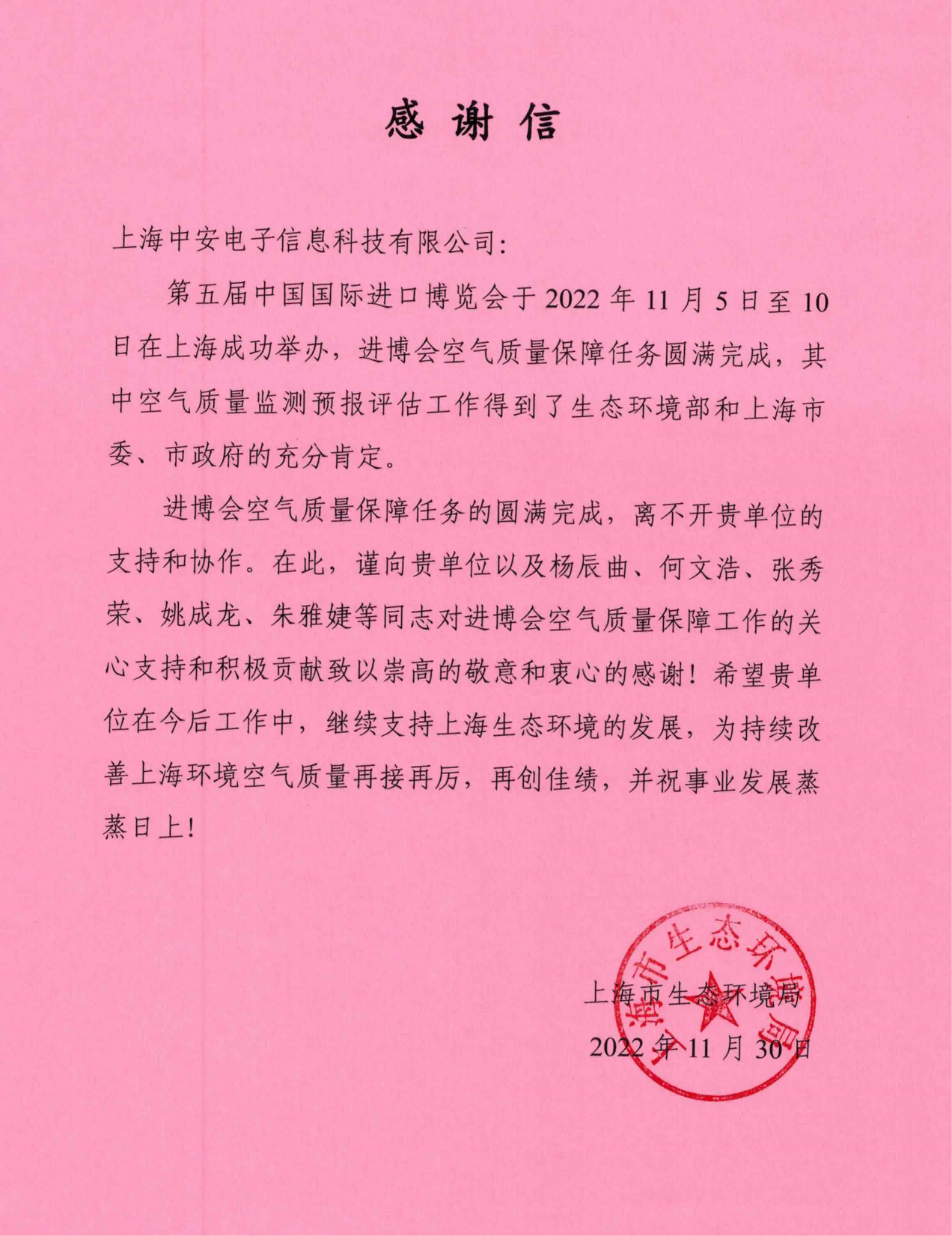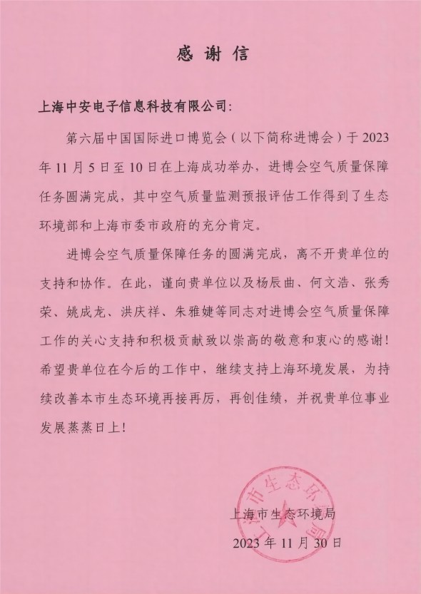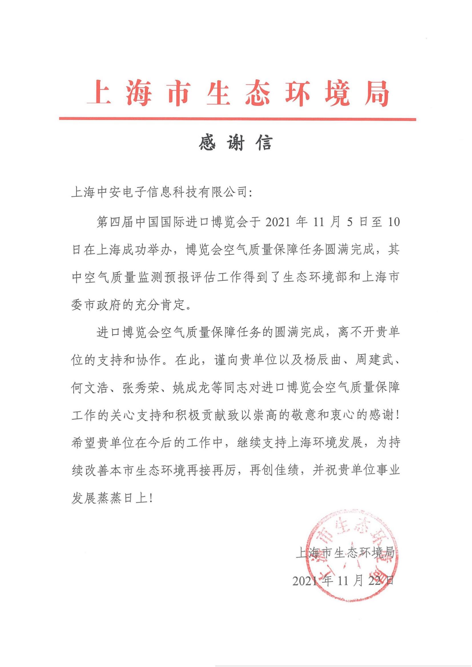 上海環(huán)監(jiān)中心就中安科技在21年國際進(jìn)博會(huì)空氣質(zhì)量監(jiān)測預(yù)報(bào)工作中杰出貢獻(xiàn)送來感謝信?。?021/12/31)